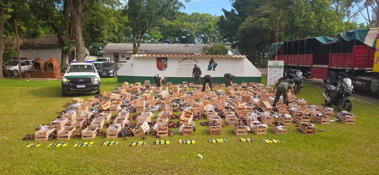 Los gendarmes, con la ayuda del can «Oreo» pudieron extraer del interior de los cajones con 1.200 kilos de berenjena, 30 paquetes rectangulares que contenían la droga.