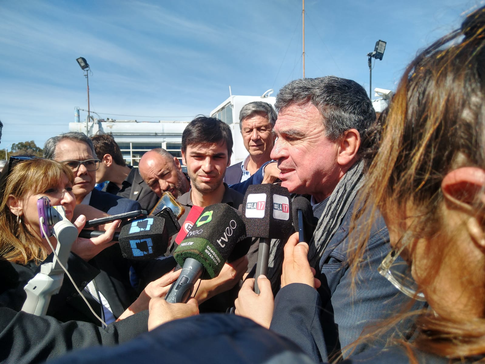 El presidente de Aluar, Javier Madanes Quintanilla, esperó pacientemente la llegada de los Gobernadores en la explanada de ingreso a la imponente y única fabrica de aluminio primario que ha logrado el pais en sus más de 200 años de historia.