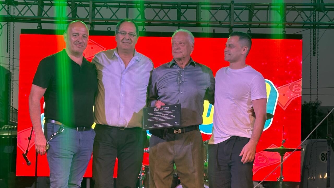 Autoridades del IAS entregaron una placa de reconocimiento a Eduardo Engrassi, dueño de la Agencia 1001 por su constante compromiso, trabajo y acompañamiento para el impulso de venta a los productos de Lotería del Chubut.